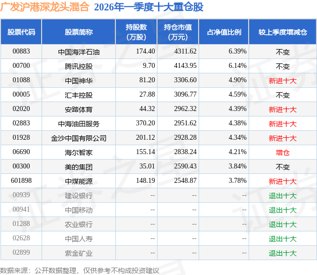 从基金规模来看,广发沪港深龙头混合基金2026年一季度公布的基金规模为6.74亿元,较上一期规模6.84亿元变化了-988.38万元,环比变化了-1.44%。该基金最新一期资产配置为:股票占净值比78.43%,无债券类资产,现金占净值比19.52%。从基金持仓来看,该基金当季前十大股票仓位达46.96%,第一大重仓股为中国海洋石油(00883),持仓占比为6.39%。