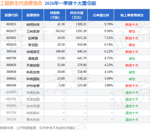 从基金规模来看,工银新生代消费混合基金2026年一季度公布的基金规模为1.35亿元,较上一期规模9390.86万元变化了4108.85万元,环比变化了43.75%。该基金最新一期资产配置为:股票占净值比94.36%,无债券类资产,现金占净值比6.01%。从基金持仓来看,该基金当季前十大股票仓位达60.73%,第一大重仓股为裕同科技(002831),持仓占比为9.7%。