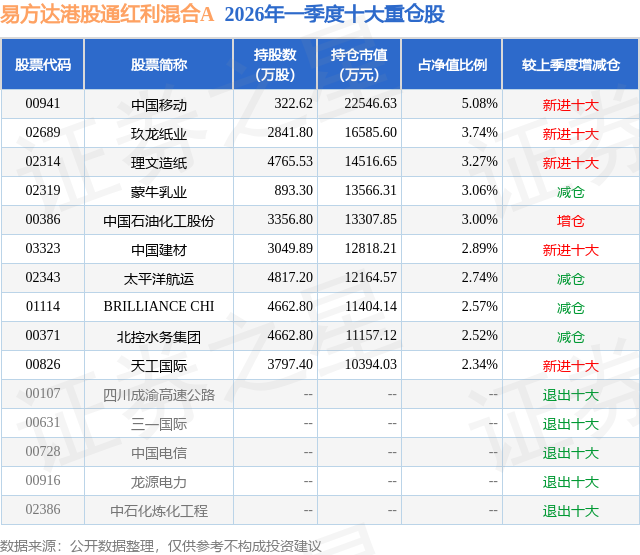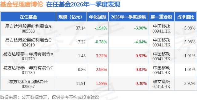 从基金规模来看,易方达港股通红利混合A基金2026年一季度公布的基金规模为37.14亿元,较上一期规模13.26亿元变化了23.88亿元,环比变化了180.15%。该基金最新一期资产配置为:股票占净值比87.31%,无债券类资产,现金占净值比12.04%。从基金持仓来看,该基金当季前十大股票仓位达31.21%,第一大重仓股为中国移动(00941),持仓占比为5.08%。
