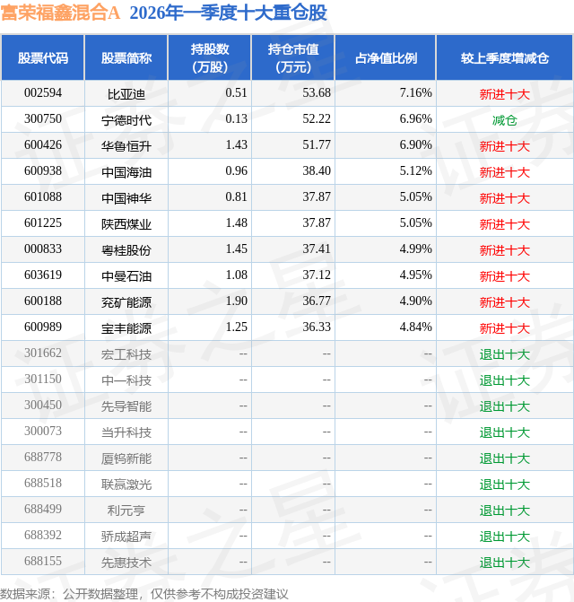 从基金规模来看,富荣福鑫混合A基金2026年一季度公布的基金规模为0.01亿元,较上一期规模24.77万元变化了71.19万元,环比变化了287.44%。该基金最新一期资产配置为:股票占净值比65.46%,债券占净值比5.38%,现金占净值比34.02%。从基金持仓来看,该基金当季前十大股票仓位达55.92%,第一大重仓股为比亚迪(002594),持仓占比为7.16%。