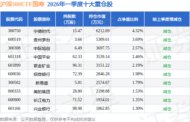 从基金规模来看,沪深300ETF国寿基金2026年一季度公布的基金规模为14.38亿元,较上一期规模22.99亿元变化了-8.61亿元,环比变化了-37.46%。该基金最新一期资产配置为:股票占净值比99.19%,无债券类资产,现金占净值比0.84%。从基金持仓来看,该基金当季前十大股票仓位达23.18%,第一大重仓股为宁德时代(300750),持仓占比为4.32%。