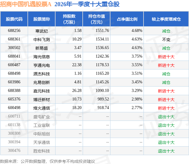 从基金规模来看,招商中国机遇股票A基金2026年一季度公布的基金规模为2.5亿元,较上一期规模1.94亿元变化了5655.34万元,环比变化了29.2%。该基金最新一期资产配置为:股票占净值比92.97%,债券占净值比5.81%,现金占净值比1.68%。从基金持仓来看,该基金当季前十大股票仓位达37.24%,第一大重仓股为寒武纪(688256),持仓占比为4.68%。