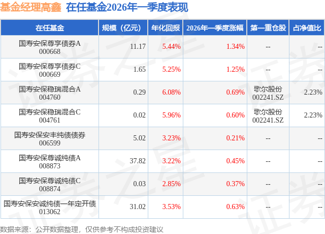 国寿安保稳瑞混合A现任基金经理为余罡 高鑫,本季度增聘基金经理余罡,近期离任的基金经理为李捷。其中在任基金经理高鑫已从业5年又55天,2026年3月31日正式接手管理国寿安保稳瑞混合A,任职期间累计回报为1.53%。目前还管理着8只基金产品(包括A类和C类),其中本季度表现最佳的基金为国寿安保尊享债券A(000668),季度净值涨幅为1.34%。