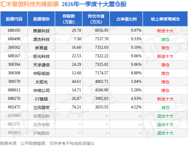 从基金规模来看,汇丰晋信科技先锋股票基金2026年一季度公布的基金规模为8.08亿元,较上一期规模3.12亿元变化了4.96亿元,环比变化了158.94%。该基金最新一期资产配置为:股票占净值比94.39%,债券占净值比3.57%,现金占净值比1.97%。从基金持仓来看,该基金当季前十大股票仓位达76.37%,第一大重仓股为腾景科技(688195),持仓占比为9.97%。