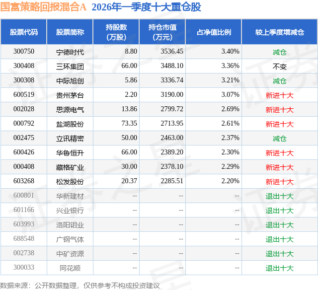 从基金规模来看,国富策略回报混合A基金2026年一季度公布的基金规模为7.53亿元,较上一期规模7.68亿元变化了-1550.95万元,环比变化了-2.02%。该基金最新一期资产配置为:股票占净值比79.47%,债券占净值比12.72%,现金占净值比9.72%。从基金持仓来看,该基金当季前十大股票仓位达27.5%,第一大重仓股为宁德时代(300750),持仓占比为3.4%。