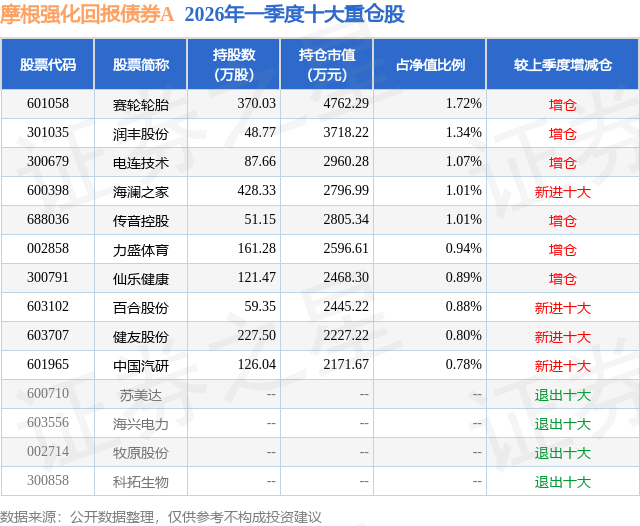 从基金规模来看,摩根强化回报债券A基金2026年一季度公布的基金规模为18.47亿元,较上一期规模1.18亿元变化了17.29亿元,环比变化了1461.98%。该基金最新一期资产配置为:股票占净值比19.84%,债券占净值比84.52%,现金占净值比0.59%。从基金持仓来看,该基金当季前十大股票仓位达10.44%,第一大重仓股为赛轮轮胎(601058),持仓占比为1.72%。
