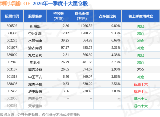 从基金规模来看,博时卓越LOF基金2026年一季度公布的基金规模为1.29亿元,较上一期规模1.31亿元变化了-227.22万元,环比变化了-1.73%。该基金最新一期资产配置为:股票占净值比60.34%,无债券类资产,现金占净值比40.41%。从基金持仓来看,该基金当季前十大股票仓位达49.67%,第一大重仓股为新易盛(300502),持仓占比为9.8%。