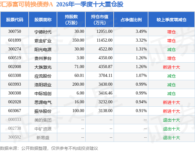 从基金规模来看,汇添富可转换债券A基金2026年一季度公布的基金规模为24.31亿元,较上一期规模49.83亿元变化了-25.53亿元,环比变化了-51.23%。该基金最新一期资产配置为:股票占净值比18.63%,债券占净值比82.28%,现金占净值比0.3%。从基金持仓来看,该基金当季前十大股票仓位达15.54%,第一大重仓股为宁德时代(300750),持仓占比为3.49%。