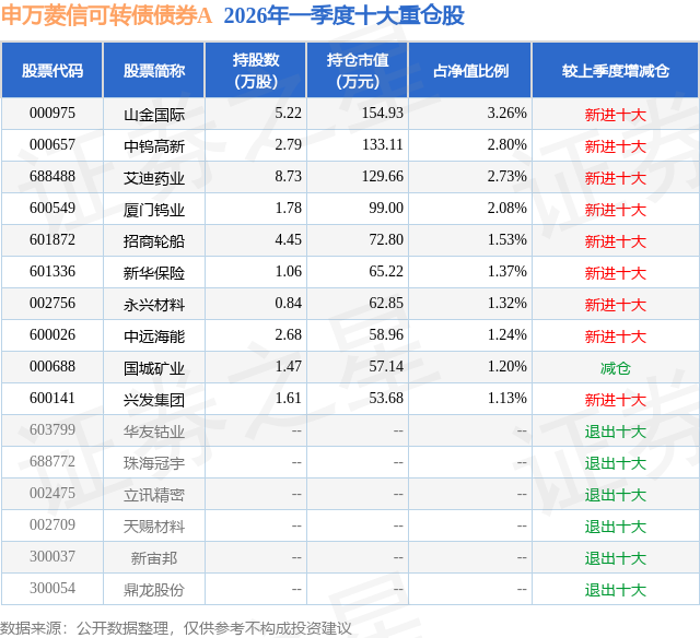 从基金规模来看,申万菱信可转债债券A基金2026年一季度公布的基金规模为0.36亿元,较上一期规模4257.77万元变化了-659.23万元,环比变化了-15.48%。该基金最新一期资产配置为:股票占净值比19.93%,债券占净值比100.76%,现金占净值比1.63%。从基金持仓来看,该基金当季前十大股票仓位达18.66%,第一大重仓股为山金国际(000975),持仓占比为3.26%。