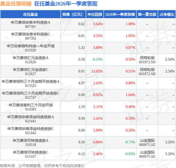 证券之星消息,日前申万菱信可转债债券A基金公布一季报,2026年一季度最新规模0.36亿元,季度净值涨幅为-0.73%。