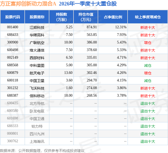 从基金规模来看,方正富邦创新动力混合A基金2026年一季度公布的基金规模为0.22亿元,较上一期规模2396.05万元变化了-204.35万元,环比变化了-8.53%。该基金最新一期资产配置为:股票占净值比93.62%,无债券类资产,现金占净值比8.1%。从基金持仓来看,该基金当季前十大股票仓位达56.05%,第一大重仓股为江顺科技(001400),持仓占比为12.31%。