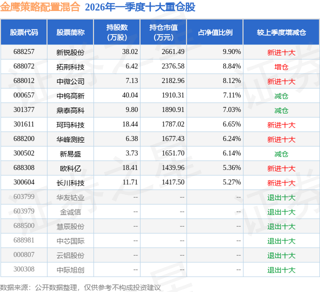 从基金规模来看,金鹰策略配置混合基金2026年一季度公布的基金规模为2.69亿元,较上一期规模3.81亿元变化了-1.12亿元,环比变化了-29.47%。该基金最新一期资产配置为:股票占净值比94.22%,债券占净值比1.62%,现金占净值比4.72%。从基金持仓来看,该基金当季前十大股票仓位达70.66%,第一大重仓股为新锐股份(688257),持仓占比为9.9%。