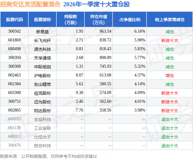 从基金规模来看,招商安达灵活配置混合基金2026年一季度公布的基金规模为1.4亿元,较上一期规模8660.11万元变化了5366.26万元,环比变化了61.97%。该基金最新一期资产配置为:股票占净值比80.18%,债券占净值比24.24%,现金占净值比1.0%。从基金持仓来看,该基金当季前十大股票仓位达49.65%,第一大重仓股为新易盛(300502),持仓占比为6.16%。