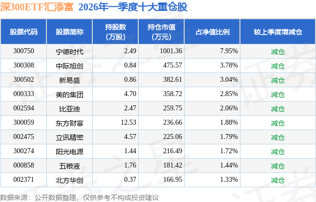 从基金规模来看,深300ETF汇添富基金2026年一季度公布的基金规模为1.26亿元,较上一期规模1.41亿元变化了-1498.25万元,环比变化了-10.63%。该基金最新一期资产配置为:股票占净值比99.54%,无债券类资产,现金占净值比0.65%。从基金持仓来看,该基金当季前十大股票仓位达27.84%,第一大重仓股为宁德时代(300750),持仓占比为7.95%。