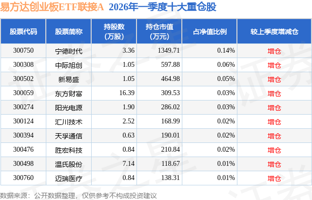 证券之星消息,日前易方达创业板ETF联接A基金公布一季报,2026年一季度最新规模59.14亿元,季度净值涨幅为-0.43%。