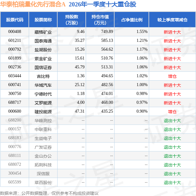 从基金规模来看,华泰柏瑞量化先行混合A基金2026年一季度公布的基金规模为3.14亿元,较上一期规模3.43亿元变化了-2880.26万元,环比变化了-8.4%。该基金最新一期资产配置为:股票占净值比93.13%,债券占净值比0.94%,现金占净值比6.15%。从基金持仓来看,该基金当季前十大股票仓位达10.92%,第一大重仓股为藏格矿业(000408),持仓占比为1.55%。