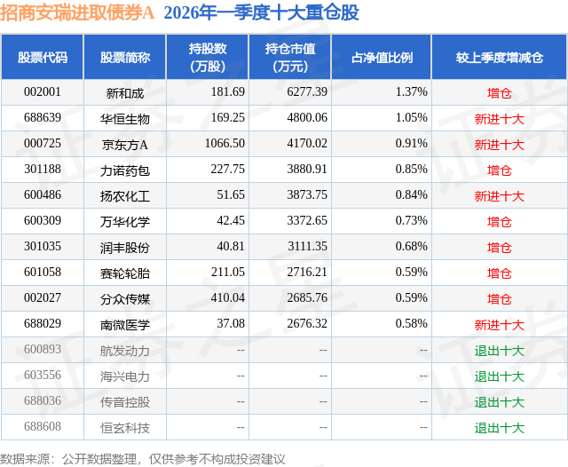 从基金规模来看,招商安瑞进取债券A基金2026年一季度公布的基金规模为20.97亿元,较上一期规模1.73亿元变化了19.24亿元,环比变化了1111.55%。该基金最新一期资产配置为:股票占净值比20.12%,债券占净值比91.43%,现金占净值比1.24%。从基金持仓来看,该基金当季前十大股票仓位达8.19%,第一大重仓股为新和成(002001),持仓占比为1.37%。