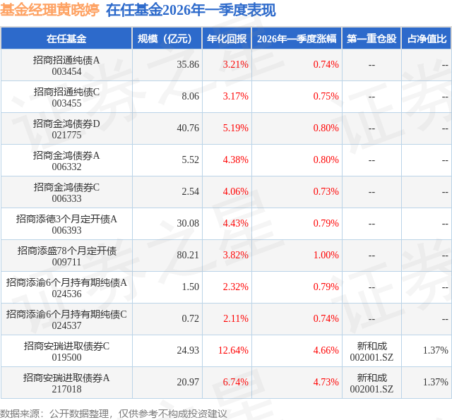 招商安瑞进取债券A现任基金经理为况冲 黄晓婷,本季度增聘基金经理黄晓婷。其中在任基金经理黄晓婷已从业7年又97天,2026年1月29日正式接手管理招商安瑞进取债券A,任职期间累计回报为2.65%。目前还管理着11只基金产品(包括A类和C类),其中本季度表现最佳的基金为招商安瑞进取债券A(217018),季度净值涨幅为4.73%。