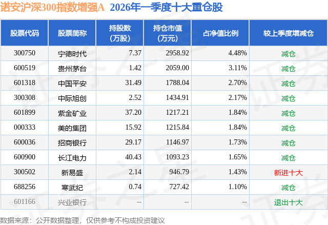 从基金规模来看,诺安沪深300指数增强A基金2026年一季度公布的基金规模为3.53亿元,较上一期规模6.19亿元变化了-2.66亿元,环比变化了-43.02%。该基金最新一期资产配置为:股票占净值比94.06%,债券占净值比1.06%,现金占净值比5.73%。从基金持仓来看,该基金当季前十大股票仓位达22.05%,第一大重仓股为宁德时代(300750),持仓占比为4.48%。