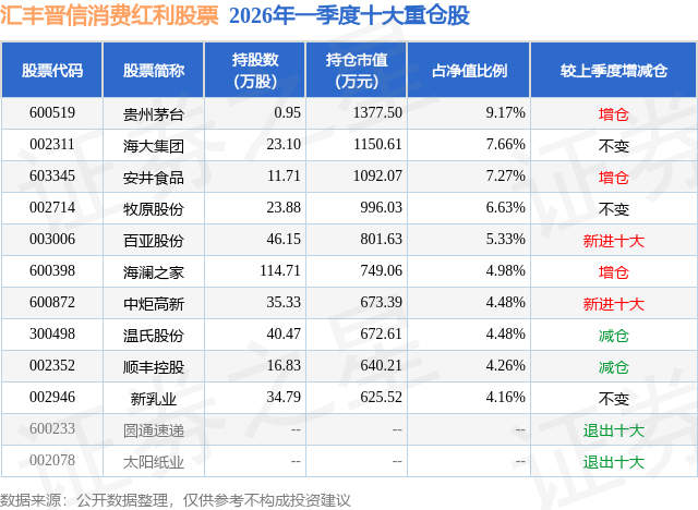从基金规模来看,汇丰晋信消费红利股票基金2026年一季度公布的基金规模为1.5亿元,较上一期规模1.26亿元变化了2421.08万元,环比变化了19.2%。该基金最新一期资产配置为:股票占净值比90.53%,无债券类资产,现金占净值比8.32%。从基金持仓来看,该基金当季前十大股票仓位达58.42%,第一大重仓股为贵州茅台(600519),持仓占比为9.17%。