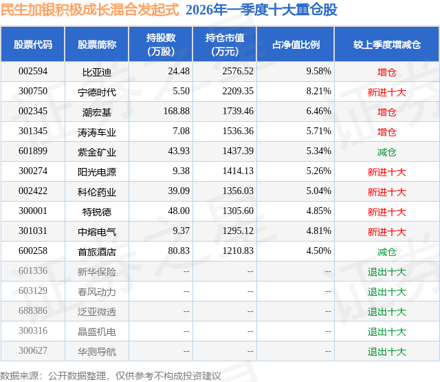 从基金规模来看,民生加银积极成长混合发起式基金2026年一季度公布的基金规模为2.69亿元,较上一期规模2.97亿元变化了-2784.31万元,环比变化了-9.38%。该基金最新一期资产配置为:股票占净值比88.06%,无债券类资产,现金占净值比12.07%。从基金持仓来看,该基金当季前十大股票仓位达59.76%,第一大重仓股为比亚迪(002594),持仓占比为9.58%。