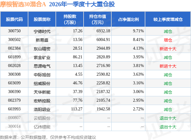 证券之星消息,日前摩根智选30混合A基金公布一季报,2026年一季度最新规模7.1亿元,季度净值涨幅为-0.46%。