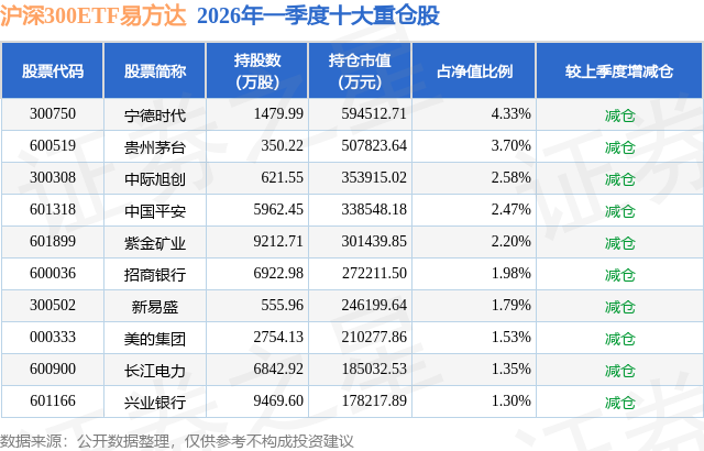 从基金规模来看,沪深300ETF易方达基金2026年一季度公布的基金规模为371.74亿元,较上一期规模3002.2亿元变化了-1630.46亿元,环比变化了-54.31%。该基金最新一期资产配置为:股票占净值比99.12%,无债券类资产,现金占净值比0.81%。从基金持仓来看,该基金当季前十大股票仓位达23.23%,第一大重仓股为宁德时代(300750),持仓占比为4.33%。