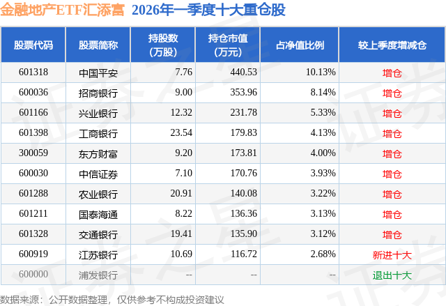证券之星消息,日前金融地产ETF汇添富基金公布一季报,2026年一季度最新规模0.44亿元,季度净值涨幅为-9.11%。