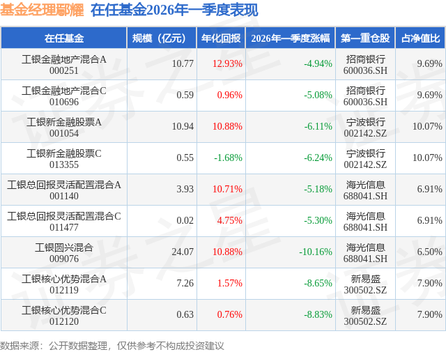 证券之星消息,日前工银金融地产混合A基金公布一季报,2026年一季度最新规模10.77亿元,季度净值涨幅为-4.94%。