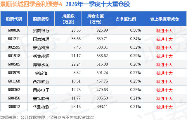 从基金规模来看,景顺长城四季金利债券A基金2026年一季度公布的基金规模为16.02亿元,较上一期规模31.43亿元变化了-15.41亿元,环比变化了-49.04%。该基金最新一期资产配置为:股票占净值比6.36%,债券占净值比113.27%,现金占净值比0.23%。从基金持仓来看,该基金当季前十大股票仓位达2.92%,第一大重仓股为招商银行(600036),持仓占比为0.5%。