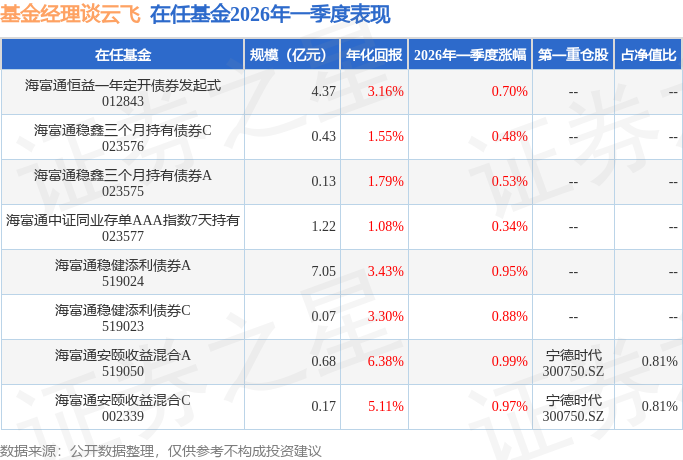证券之星消息,日前海富通安颐收益混合A基金公布一季报,2026年一季度最新规模0.68亿元,季度净值涨幅为0.99%。