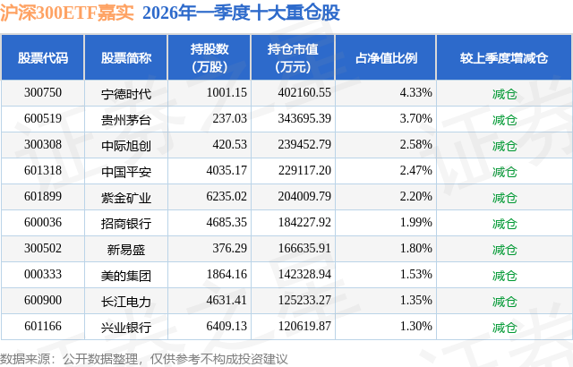 从基金规模来看,沪深300ETF嘉实基金2026年一季度公布的基金规模为928.03亿元,较上一期规模1971.24亿元变化了-1043.21亿元,环比变化了-52.92%。该基金最新一期资产配置为:股票占净值比99.11%,无债券类资产,现金占净值比0.93%。从基金持仓来看,该基金当季前十大股票仓位达23.25%,第一大重仓股为宁德时代(300750),持仓占比为4.33%。