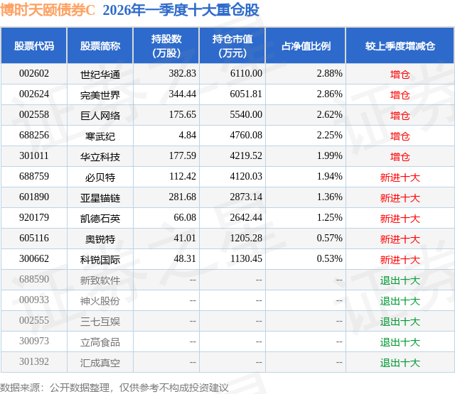 从基金规模来看,博时天颐债券C基金2026年一季度公布的基金规模为3.16亿元,较上一期规模4131.32万元变化了2.75亿元,环比变化了666.04%。该基金最新一期资产配置为:股票占净值比19.75%,债券占净值比92.46%,现金占净值比5.05%。从基金持仓来看,该基金当季前十大股票仓位达18.25%,第一大重仓股为世纪华通(002602),持仓占比为2.88%。