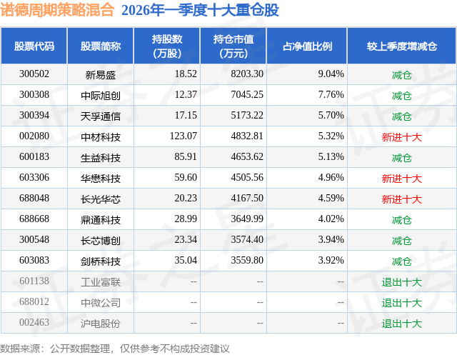 从基金规模来看,诺德周期策略混合基金2026年一季度公布的基金规模为9.08亿元,较上一期规模7.47亿元变化了1.61亿元,环比变化了21.54%。该基金最新一期资产配置为:股票占净值比89.63%,无债券类资产,现金占净值比10.94%。从基金持仓来看,该基金当季前十大股票仓位达54.38%,第一大重仓股为新易盛(300502),持仓占比为9.04%。