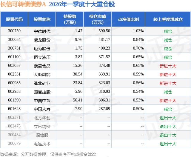 从基金规模来看,长信可转债债券A基金2026年一季度公布的基金规模为2.17亿元,较上一期规模2.67亿元变化了-4976.66万元,环比变化了-18.67%。该基金最新一期资产配置为:股票占净值比13.77%,债券占净值比97.7%,现金占净值比5.51%。从基金持仓来看,该基金当季前十大股票仓位达6.59%,第一大重仓股为宁德时代(300750),持仓占比为1.03%。