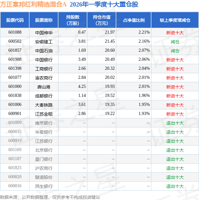 从基金规模来看,方正富邦红利精选混合A基金2026年一季度公布的基金规模为0.08亿元,较上一期规模3314.54万元变化了-2488.16万元,环比变化了-75.07%。该基金最新一期资产配置为:股票占净值比94.06%,无债券类资产,现金占净值比6.16%。从基金持仓来看,该基金当季前十大股票仓位达20.4%,第一大重仓股为中国神华(601088),持仓占比为2.21%。