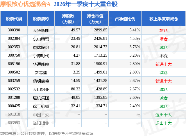 从基金规模来看,摩根核心优选混合A基金2026年一季度公布的基金规模为5.35亿元,较上一期规模5.27亿元变化了788.14万元,环比变化了1.49%。该基金最新一期资产配置为:股票占净值比86.57%,无债券类资产,现金占净值比11.66%。从基金持仓来看,该基金当季前十大股票仓位达32.93%,第一大重仓股为天华新能(300390),持仓占比为5.41%。