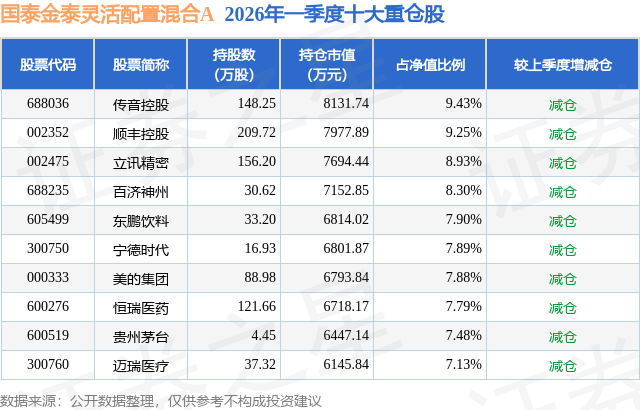 从基金规模来看,国泰金泰灵活配置混合A基金2026年一季度公布的基金规模为5.37亿元,较上一期规模4.73亿元变化了6362.36万元,环比变化了13.45%。该基金最新一期资产配置为:股票占净值比94.53%,无债券类资产,现金占净值比5.8%。从基金持仓来看,该基金当季前十大股票仓位达81.98%,第一大重仓股为传音控股(688036),持仓占比为9.43%。
