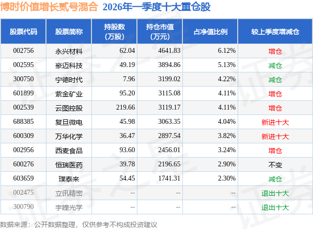 从基金规模来看,博时价值增长贰号混合基金2026年一季度公布的基金规模为7.59亿元,较上一期规模7.28亿元变化了3090.04万元,环比变化了4.25%。该基金最新一期资产配置为:股票占净值比71.44%,债券占净值比22.08%,现金占净值比6.2%。从基金持仓来看,该基金当季前十大股票仓位达39.99%,第一大重仓股为永兴材料(002756),持仓占比为6.12%。