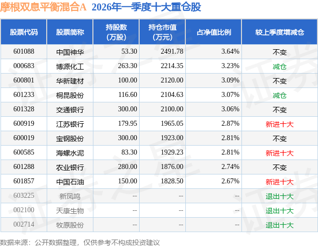 从基金规模来看,摩根双息平衡混合A基金2026年一季度公布的基金规模为6.83亿元,较上一期规模7.86亿元变化了-1.03亿元,环比变化了-13.06%。该基金最新一期资产配置为:股票占净值比69.43%,债券占净值比24.11%,现金占净值比7.8%。从基金持仓来看,该基金当季前十大股票仓位达29.99%,第一大重仓股为中国神华(601088),持仓占比为3.64%。
