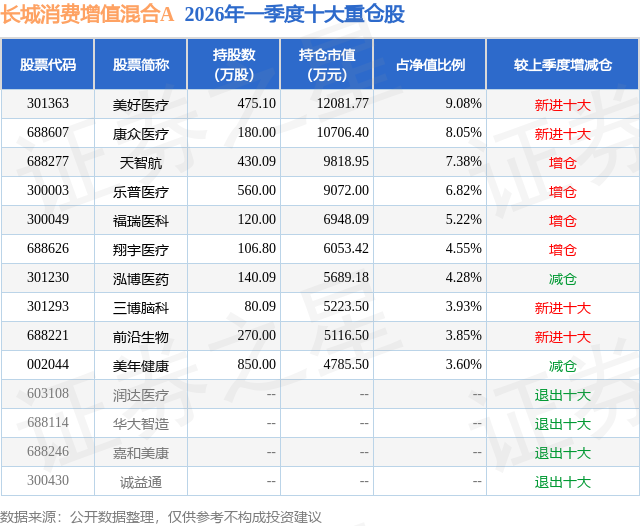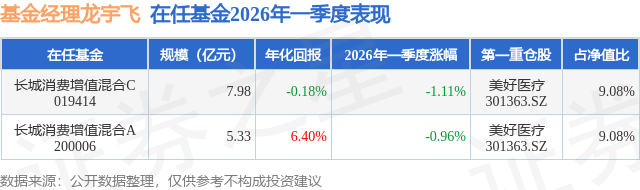 从基金规模来看,长城消费增值混合A基金2026年一季度公布的基金规模为5.33亿元,较上一期规模3.94亿元变化了1.39亿元,环比变化了35.36%。该基金最新一期资产配置为:股票占净值比91.88%,债券占净值比0.22%,现金占净值比7.02%。从基金持仓来看,该基金当季前十大股票仓位达56.76%,第一大重仓股为美好医疗(301363),持仓占比为9.08%。