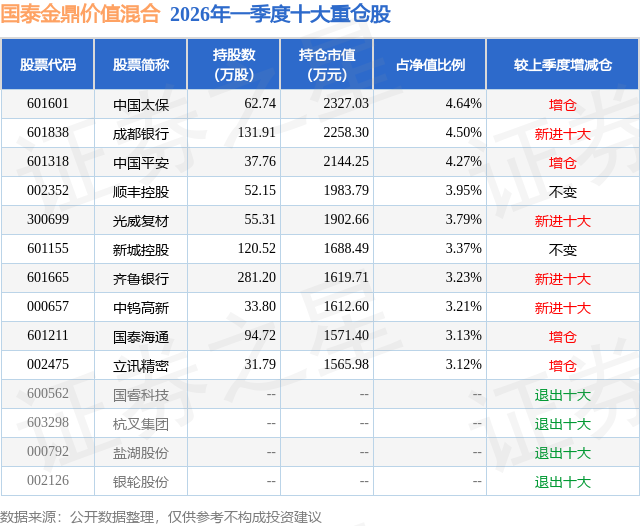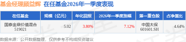 证券之星消息,日前国泰金鼎价值混合基金公布一季报,2026年一季度最新规模5.02亿元,季度净值涨幅为7.12%。