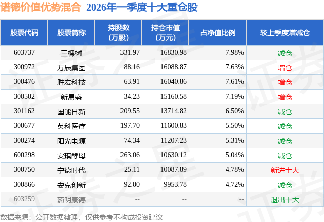 从基金规模来看,诺德价值优势混合基金2026年一季度公布的基金规模为21.09亿元,较上一期规模18.54亿元变化了2.56亿元,环比变化了13.79%。该基金最新一期资产配置为:股票占净值比92.47%,债券占净值比0.47%,现金占净值比7.33%。从基金持仓来看,该基金当季前十大股票仓位达62.26%,第一大重仓股为三棵树(603737),持仓占比为7.98%。