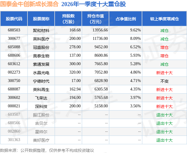 从基金规模来看,国泰金牛创新成长混合基金2026年一季度公布的基金规模为14.51亿元,较上一期规模9.58亿元变化了4.93亿元,环比变化了51.46%。该基金最新一期资产配置为:股票占净值比91.65%,无债券类资产,现金占净值比10.86%。从基金持仓来看,该基金当季前十大股票仓位达56.89%,第一大重仓股为聚和材料(688503),持仓占比为9.62%。