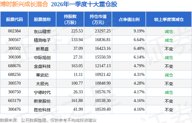 证券之星消息,日前博时新兴成长混合基金公布一季报,2026年一季度最新规模25.34亿元,季度净值涨幅为-4.66%。