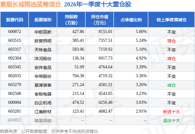 从基金规模来看,景顺长城精选蓝筹混合基金2026年一季度公布的基金规模为14.05亿元,较上一期规模15.94亿元变化了-1.89亿元,环比变化了-11.86%。该基金最新一期资产配置为:股票占净值比86.23%,债券占净值比3.6%,现金占净值比10.59%。从基金持仓来看,该基金当季前十大股票仓位达40.24%,第一大重仓股为中炬高新(600872),持仓占比为5.8%。