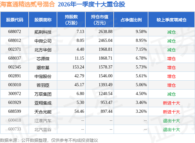 从基金规模来看,海富通精选贰号混合基金2026年一季度公布的基金规模为2.75亿元,较上一期规模3.06亿元变化了-3030.76万元,环比变化了-9.91%。该基金最新一期资产配置为:股票占净值比76.38%,债券占净值比20.95%,现金占净值比2.83%。从基金持仓来看,该基金当季前十大股票仓位达60.08%,第一大重仓股为拓荆科技(688072),持仓占比为9.58%。