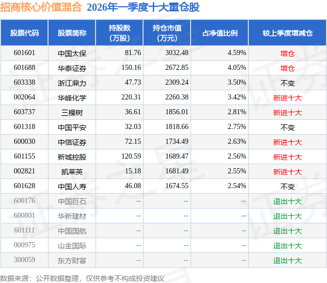 从基金规模来看,招商核心价值混合基金2026年一季度公布的基金规模为6.6亿元,较上一期规模6.19亿元变化了4142.72万元,环比变化了6.69%。该基金最新一期资产配置为:股票占净值比84.37%,无债券类资产,现金占净值比15.86%。从基金持仓来看,该基金当季前十大股票仓位达31.4%,第一大重仓股为中国太保(601601),持仓占比为4.59%。