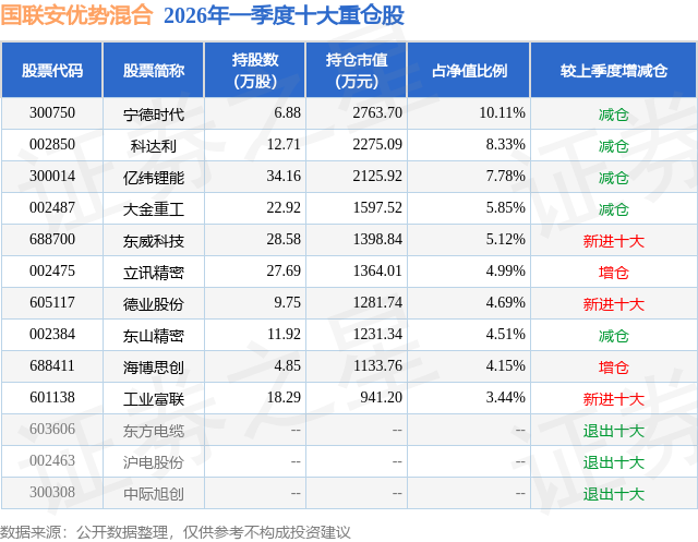 从基金规模来看,国联安优势混合基金2026年一季度公布的基金规模为2.73亿元,较上一期规模2.55亿元变化了1816.92万元,环比变化了7.12%。该基金最新一期资产配置为:股票占净值比89.18%,无债券类资产,现金占净值比11.32%。从基金持仓来看,该基金当季前十大股票仓位达58.97%,第一大重仓股为宁德时代(300750),持仓占比为10.11%。
