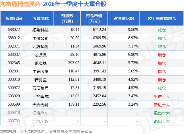 从基金规模来看,海富通精选混合基金2026年一季度公布的基金规模为7.07亿元,较上一期规模9.1亿元变化了-2.04亿元,环比变化了-22.37%。该基金最新一期资产配置为:股票占净值比76.21%,债券占净值比20.94%,现金占净值比3.12%。从基金持仓来看,该基金当季前十大股票仓位达60.03%,第一大重仓股为拓荆科技(688072),持仓占比为9.5%。